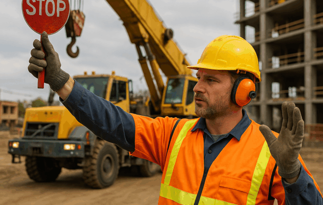 A banksman helps big vehicles and machines move safely on a building site. They stand…